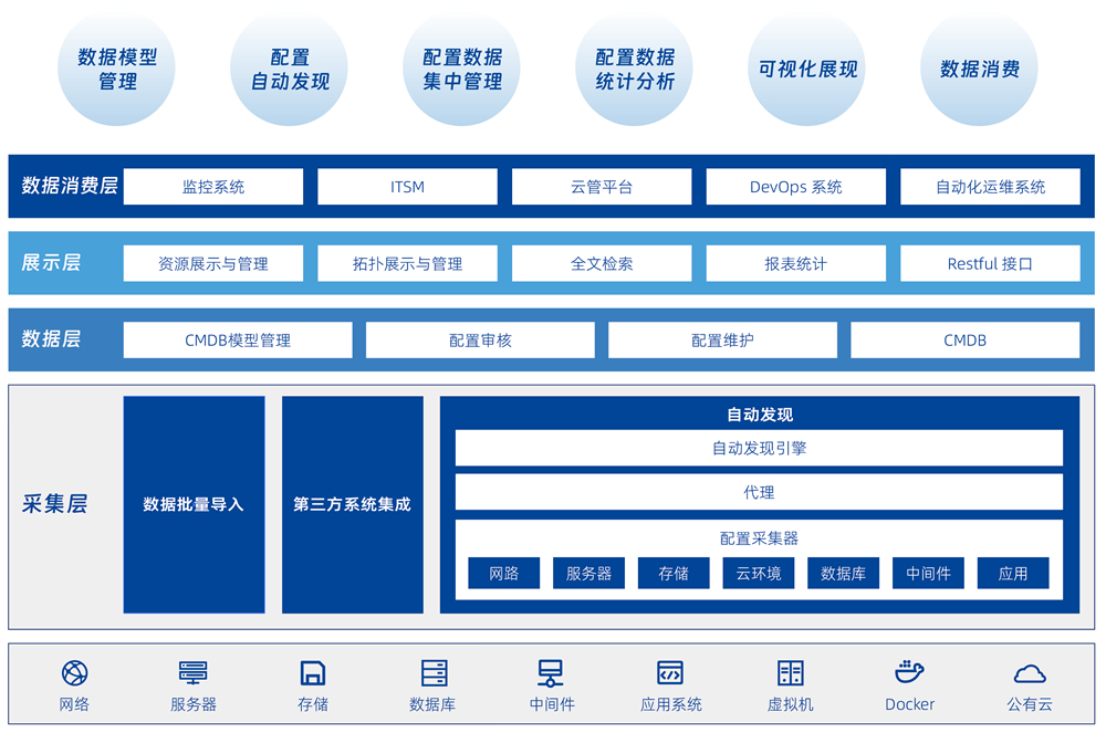 帮助用户建立统一的运维主数据,,通过各种自动化手段实现以应用为核心的全面资源管理以及运维消费场景共享。。系统具备灵活的 CMDB 分层建模和配置信息维护机制,,,,可以提供面向业务的 IT 架构画像,,,,为各个运维工具提供集中化的资源信息管理和协同,,为 IT 运维和 DevOps 体系下的各种运维场景提供数据消费服务。。。。