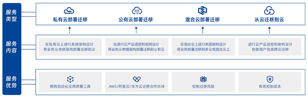 提供业务上云及云间迁移的端到端服务,,,,评估业务系统现状,,,,规划设计迁移架构、、、、迁移技术和迁移方案,,,,应用及数据上云迁移实施,,,,云上系统部署,,,云上数据及业务验证,,迁移后运维保障及持续优化服务。。。。
