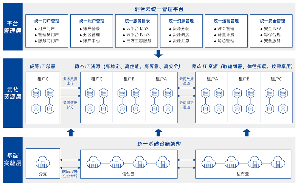 面向已部署多云、、、、信创基础设施的行业用户,,,,提供自助化、、、自动化的云服务快速交付服务。。。。管理企业内部多个数据中心的物理、、虚拟资源,,以及容器、、私有云、、公有云资源,,,并对以上资源进行混合编排,,,,提供基础软件和应用软件的自动化部署服务,,,,以及云资源的全生命周期管理。。。。