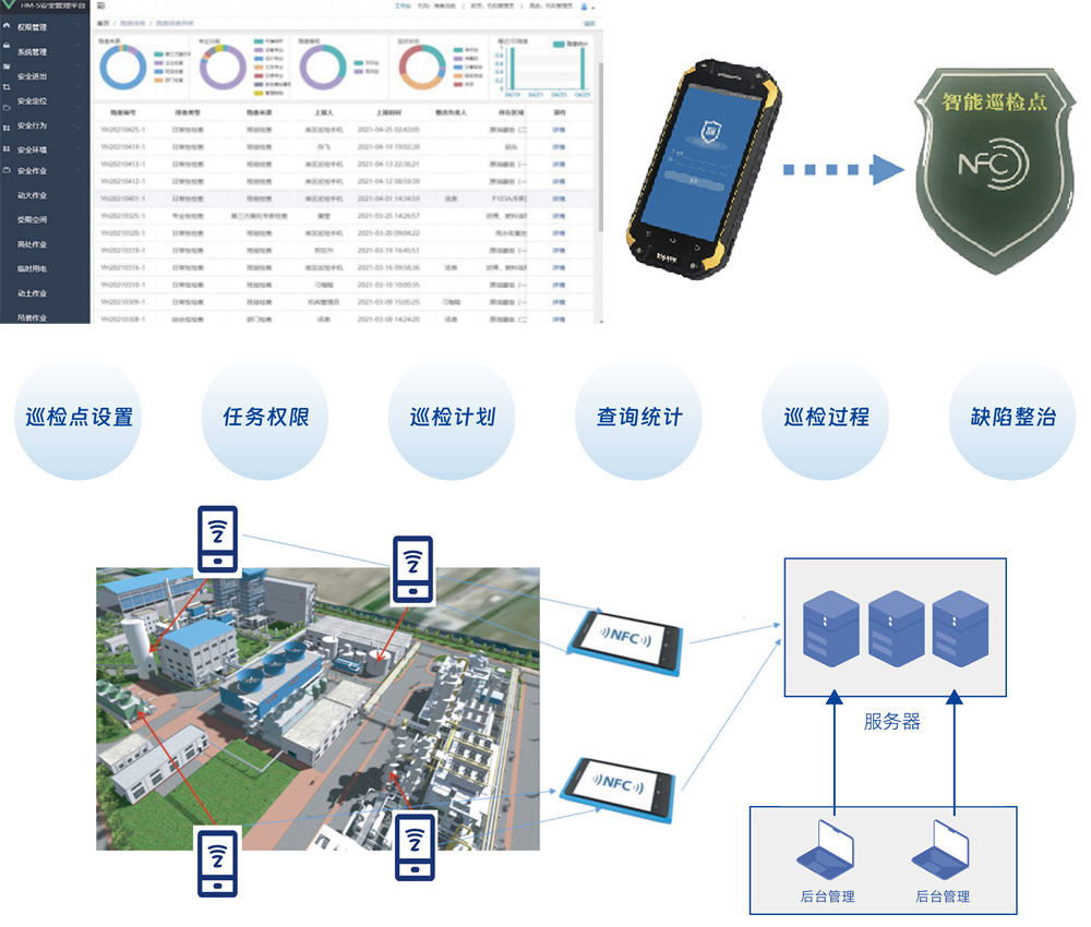 • 采用手机 NFC 的实现方式不但能够实时连接厂内网络,,,,NFC 标签还避免了二维码容易损坏和可以复制的缺点。。。。